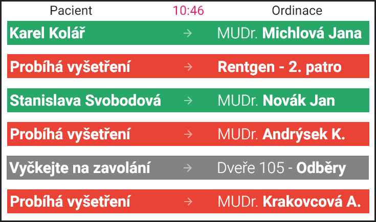 Jedná se o hardwarový doplněk systému, který je umístěn v čekárně a poskytuje čekajícím pacientům přehled o tom kdo jde právě na řadu.